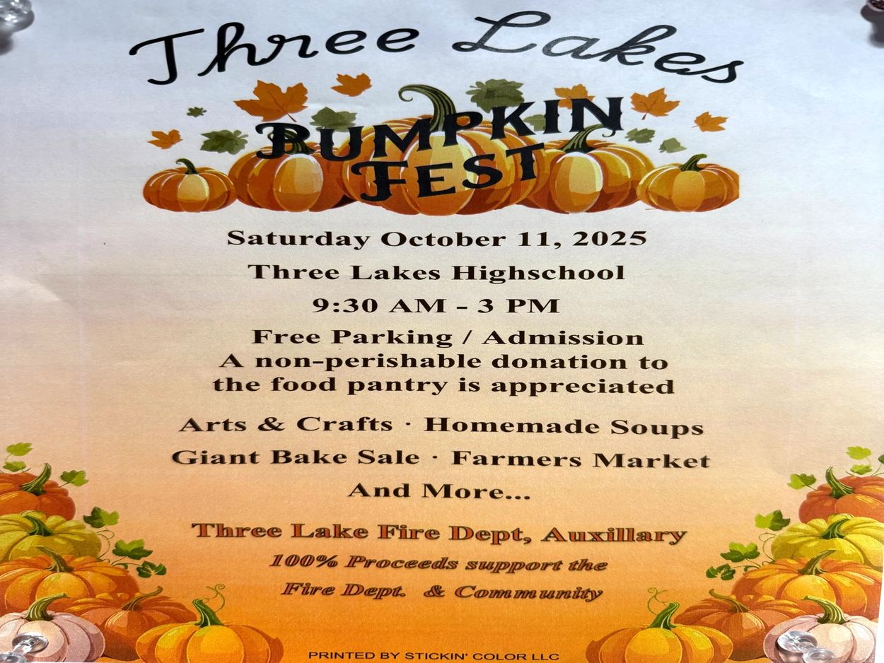 Three Lakes Fire Department Auxiliary's main fundraiser is Pumpkin Fest, every 2nd Saturday of October at the Three Lakes High School.